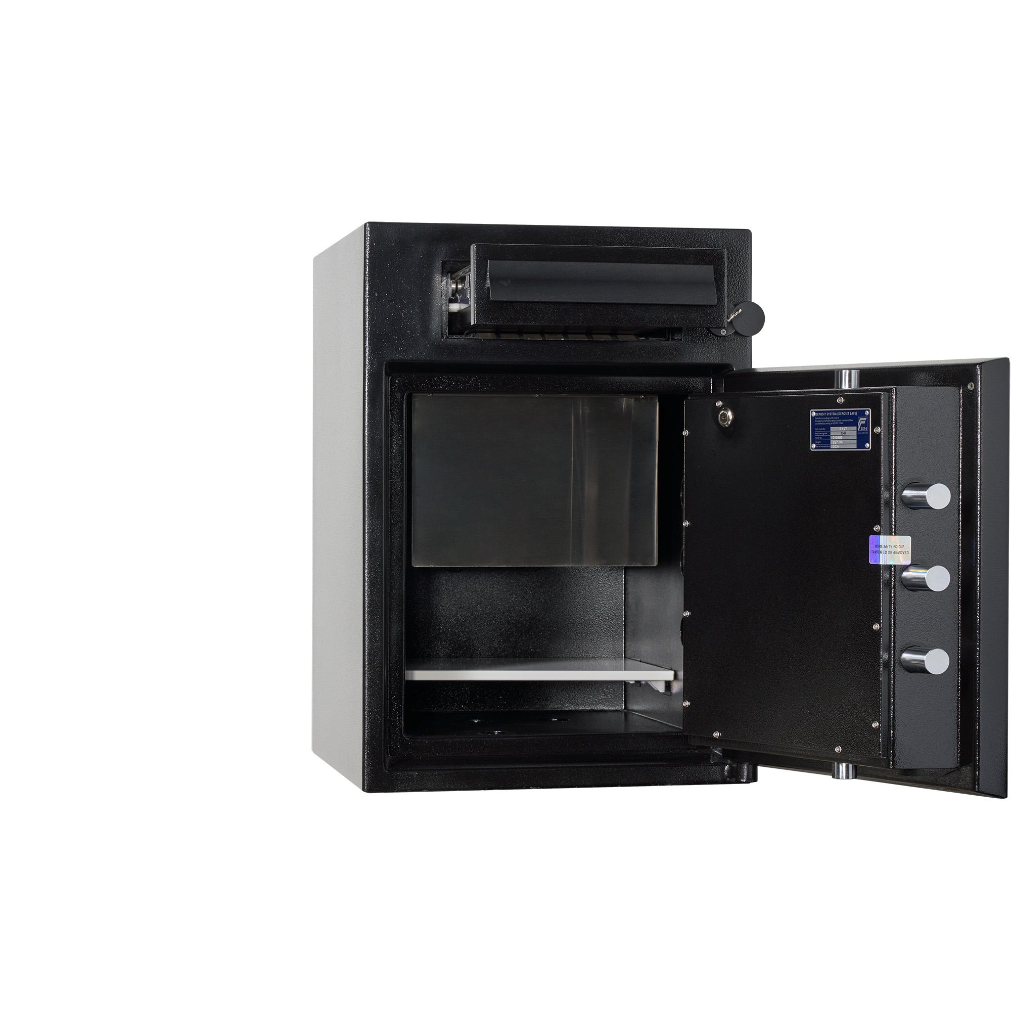 Le casseforti HTDPII4000 offrono il più alto livello di protezione antieffrazione in conformità al grado D-II secondo la norma EN 1143-2, certificato dal rinomato istituto di test ECB-S. Questo garantisce una protezione rassicurante per contanti, documenti e oggetti di valore, che si adatta perfettamente ai processi di lavoro nei settori della vendita al dettaglio, della ristorazione e dell'industria alberghiera. Il ripiano regolabile in altezza è inoltre rinforzato per offrirti non solo più spazio durante l'allestimento, ma anche per resistere a carichi elevati.