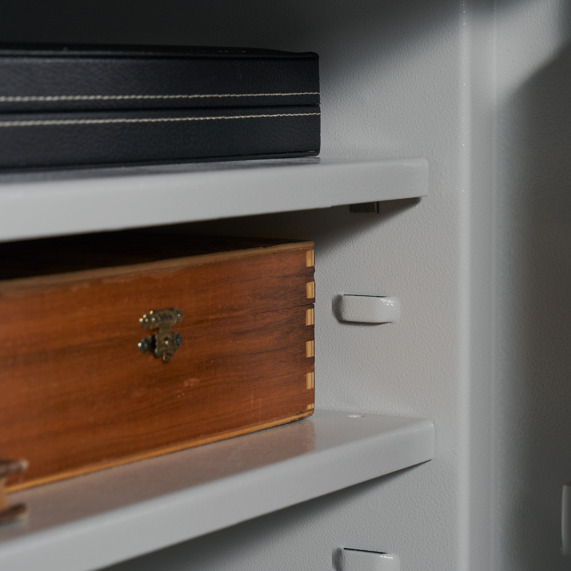 Im F 103-06 Wertschutztresor ermöglichen Ihnen zwei höhenverstellbare Fachböden die flexible Nutzung des Tresors. Sie können somit neben Ihren Wertgegenständen und Unterlagen auch Handfeuerwaffen übersichtlich vor fremdem Zugriff schützen.