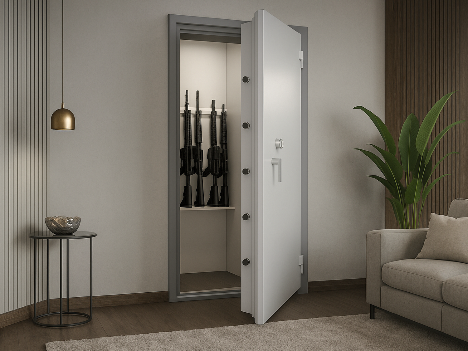 Noch mehr Sicherheit gewünscht? Da wo noch keine sicheren Räume nutzbar sind für Panzertüren, bieten wir auch Wertschutzräume in intelligenter Modulbauweise an. Der perfekt als Panzerschutzraum, begehbarer Waffenschrank oder hochsicherer Archivraum.