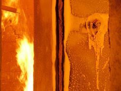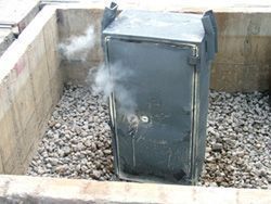 Der zweite Teil des Testverfahrens ist der Feuerstoss- und Sturztest. Für 30 Minuten wird der Tresor in einem zuvor erhitzten Brandofen auf 1‘090°C erhitzt. Danach kommt der Sturz auf ein Kies- oder Schotterbett aus einer Höhe von 9.15 m, was etwa dem 3. Stock eines Hauses entspricht. Anschliessend wird der Tresor wieder erhitzt auf 840°C und kühlt dann ab.
